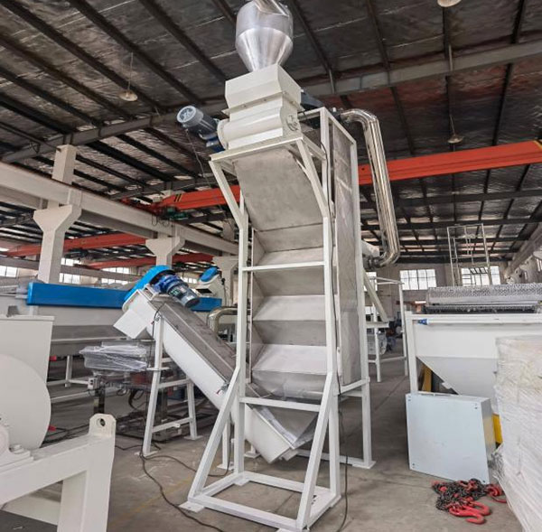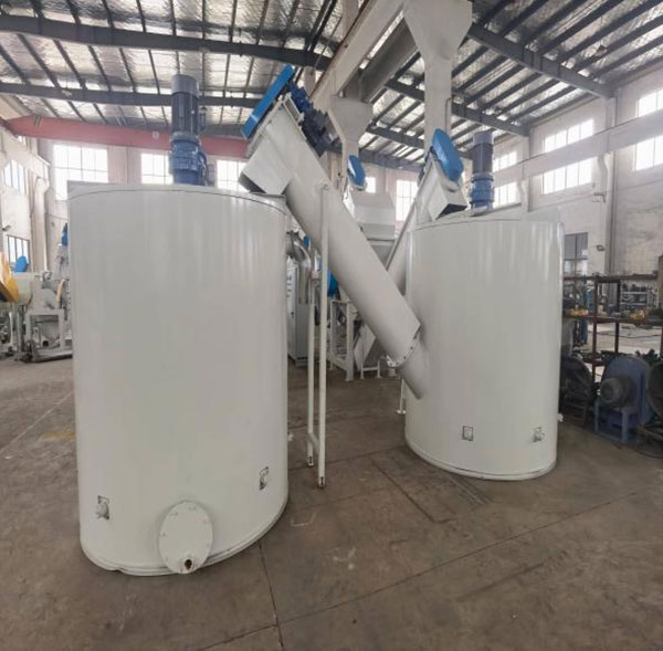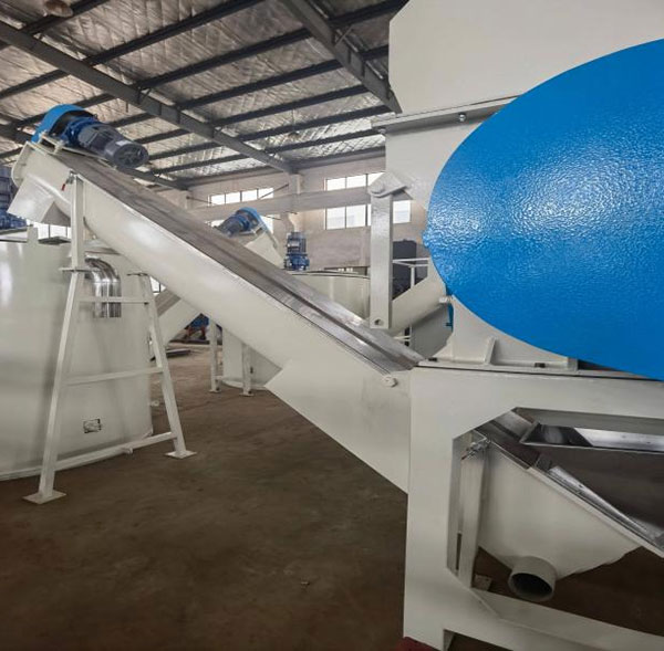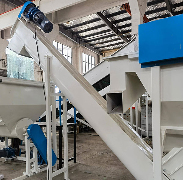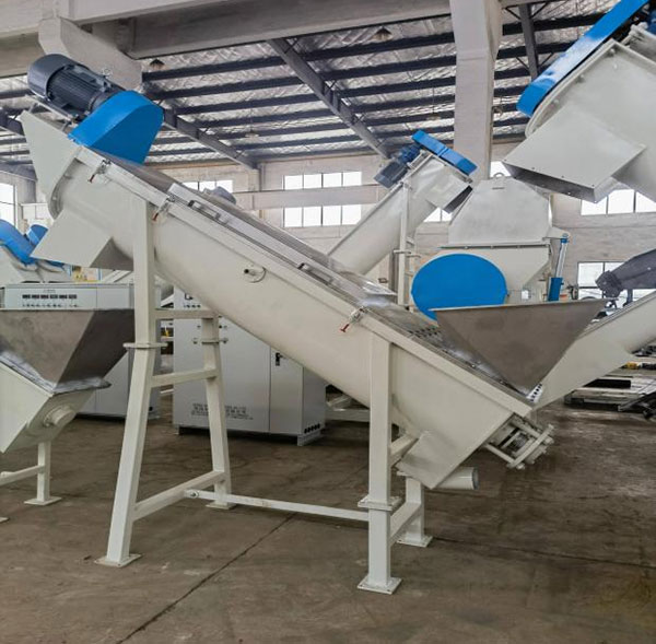 The washing tank screw loader is installed at the bottom of the sink-float washing tank to automatically convey cleaned PET flakes out of the tank. By using a rotating screw mechanism, it lifts the submerged flakes steadily while allowing excess water to drain back into the tank.